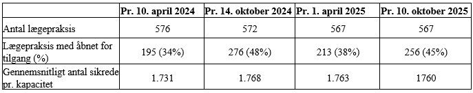 Aktuelt har 45 pct. af lægepraksis i regionen åbent for tilgang af patienter (bilag 1). Der er således flere åbne praksis pr. 10. oktober 2025 end beskrevet i seneste statussag, jf. nedenstående tabel 1. Hertil kommer et mindre antal praksis, som har selektivt åbent for tilgang af patienter. Med selektiv åbent kan klinikken have åbent for tilgang af patienter fra samme planlægningsområde, som klinikken er placeret i, men lukket for tilgang af nye patienter fra øvrige planlægningsområder. Det bemærkes at åbne/lukke data er udtryk for et øjebliksbillede, og kan derfor variere fra dag til dag.