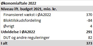 Kompensation for opgaveændringer (DUT) og andre reguleringer udgør 82 mio. kr., og samlet udvides regionens ramme således med 373 mio. kr., jf. nedenstående tabel. Heraf er de 82 mio. kr. til øremærkede formål, og der er således 291 mio. kr. til dækning af regionens merudgifter.
