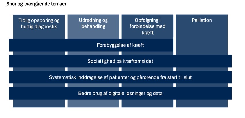 Region Hovedstadens kræftplan 2020/2021 er opdelt i to dele, som samlet indeholder anbefalinger indenfor fire spor samt en række tværgående temaer, som er skitseret i nedenstående figur. De to dele af kræftplanen er vedlagt som bilag 1 og 2.