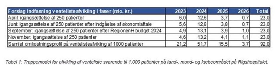 Omkostningerne forbundet med trappemodellen til afvikling af ventelisten til behandling af kæbeanomali blev estimeret til i alt 92 mio. kr. fra 2023-2026.