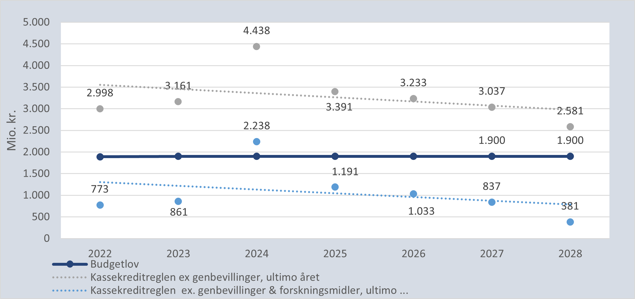 Nedenstående graf viser den forventede likviditet opgjort efter kassekreditreglen ultimo årene baseret på kendte og besluttede tillægsbevillinger. Der er stadig skærpet opmærksomhed på byggerierne.