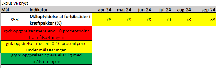 Det bemærkes, at målopfyldelsen på brystkræftområdet har været lav fra april til august 2024, og grundet det store antal patienter i brystkræftpakken er det med til at trække den samlede målopfyldelse for alle kræftpakkerne ned. Målopfyldelsen for brystkræftpakken i august 2024 var på 50 %, og der ses en positiv udvikling i september 2024, hvor målopfyldelsen var på 67 %. Det fremgår af tabel 2, at den samlede målopfyldelse på kræftpakkerne excl. brystkræftpakken var på 78 % i august 2024, og målopfyldelsen excl. brystkræft for september 2024 var 83 %.