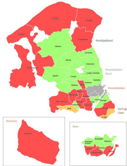 * Grøn: Antal ledige patientpladser svarende til minimum en kapacitet (1600) * Gul: Antal ledige patientpladser mellem 1-1599, svarende til mindre end en kapacitet (1600) * Rød: Ingen ledige patientpladser