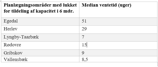 Tabel 2: Områder med lukket for tildeling i seks måneder samt længere ventetid end regionens median.